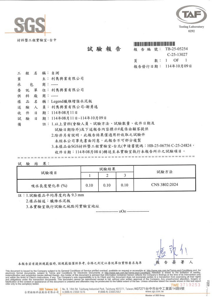 Legend纖維增強水泥板經過多項SGS實驗測試,包括不含石綿、不含甲醛、耐燃一級、容積密度、吸水率與含水率等檢測項目。透過相關測試數據與檢驗報告,可提供工程設計與施工單位評估材料性能之參考依據。